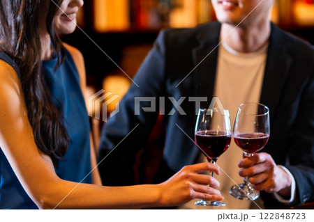 おしゃれなレストランでワイングラスを傾ける男女 顔無し