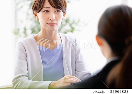 向かい合わせに座っているスーツを着た女性と会話するミドルの女性