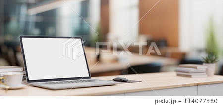 A laptop computer with a white-screen mockup on a wooden table in a room at night. place of work