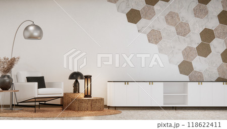 Mockup Cabinet on living room modern style with hexagon tiles wall background.3D rendering