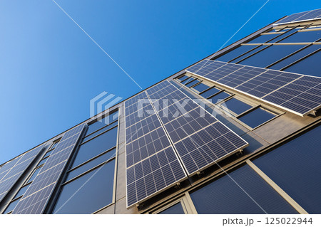 Modern building with installed solar panels on facade for renewable energy and sustainability under clear blue sky low angle view eco friendly architecture