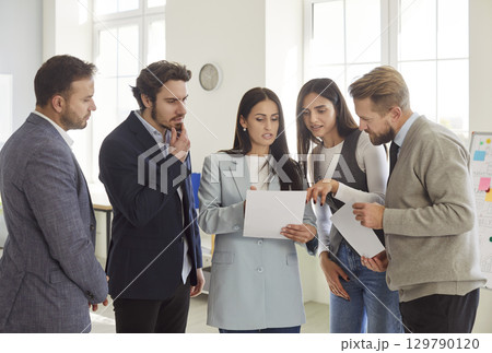 On the meeting, discussing the plans. Group of office workers are together indoors