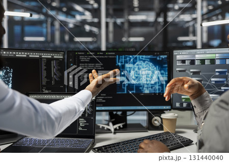 Data center technicians brainstorming, working together in office, using artificial intelligence computerized model. Server room coworkers collaborating, working with AI machine learning algorithms