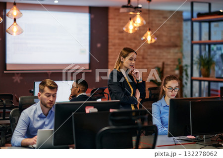 woman employee showing something to her colleagues on the monitor screen on workplace in office.