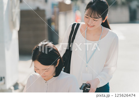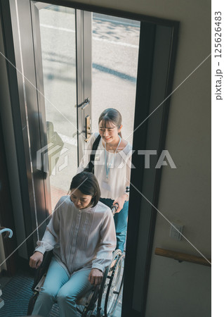 精神科入院中の統合失調症の女性と外出する精神保健福祉士のイラスト