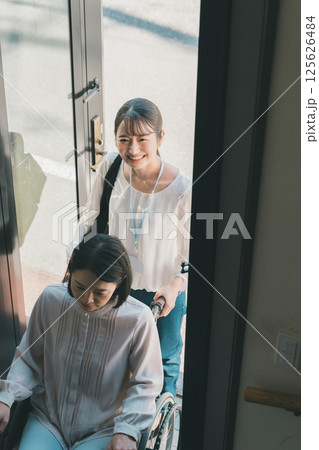 介護を受ける車椅子の少年と介護士のイラスト