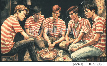 類をもって集まる:鍋バーティーの集まり。示し合わせること無く、全員が赤いボーダーシャツを着てた。