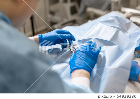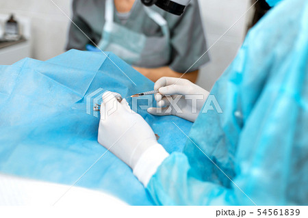 Close up of surgery team operating. The operation on the eye. Cataract surgery. Laser vision correction. Patient and team of surgeons in the operating room, patient under sterile cover