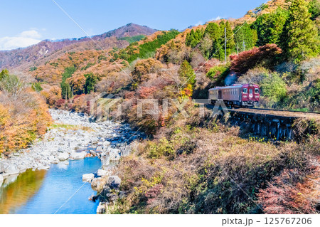 わたらせ渓谷鐵道 紅葉のわたらせ渓谷を走る列車(沢入付近)