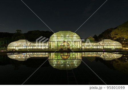 水鏡を見るライトアップされた東山植物園温室
