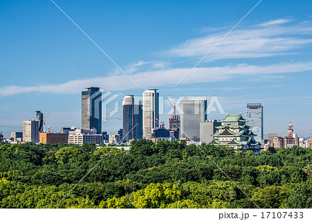 新緑の名古屋城と高層ビル群