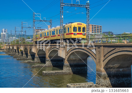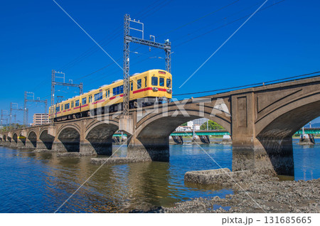 私鉄・多径間アーチ橋・単線・名島川橋梁を渡る車両番号654