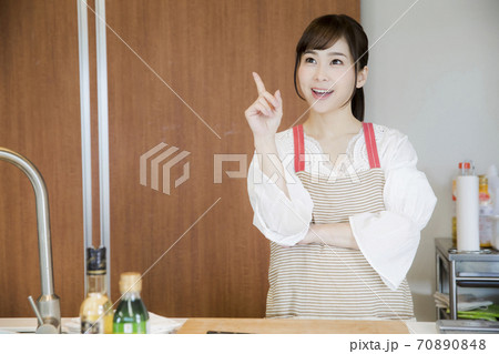 人差し指を立てているエプロンを着用した女性-ガッシュ