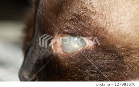 Close-up view of feline eye with cataract and brown fur details in soft lighting