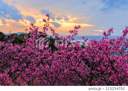 沖縄県名護市名護 名護城公園さくらの園の日本一早咲きの種類の一つである琉球寒緋桜と名護湾の夕焼け