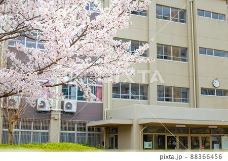 サクラと小学校校舎と青空