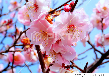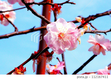 晴天の中、正面を向いて咲く梅の花