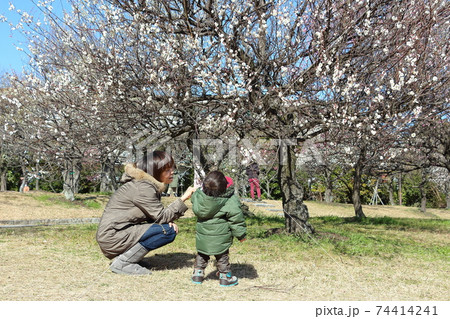 梅の木を見上げる1歳の子供と子供を見つめる母親