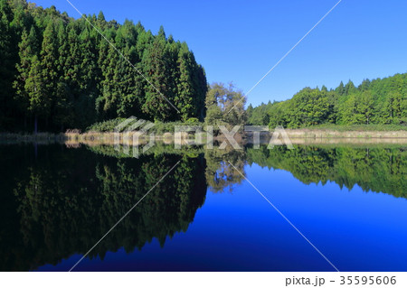 青空が映り込む池と桟橋の風景
