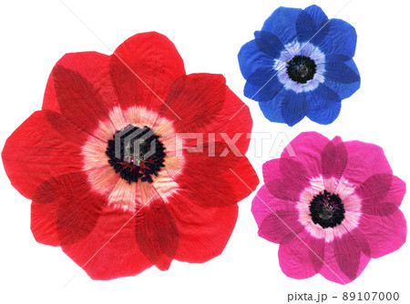 3色アネモネの押し花、カラフルな背景に