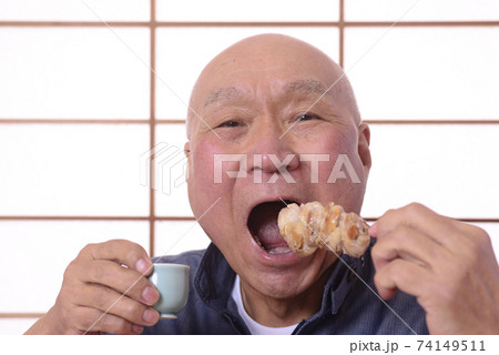 焼き鳥を食べながら日本酒を吞むシニア男性