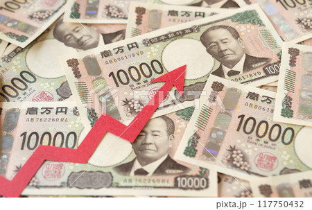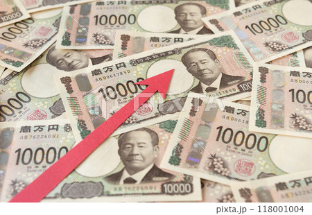 一万円札と右肩上がりの矢印 上昇 紙幣 上向き 値上げ 増税