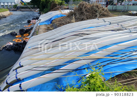 仮設されたくみ上げ用ホース(明治用水頭首工、漏水問題 愛知県 豊田市)