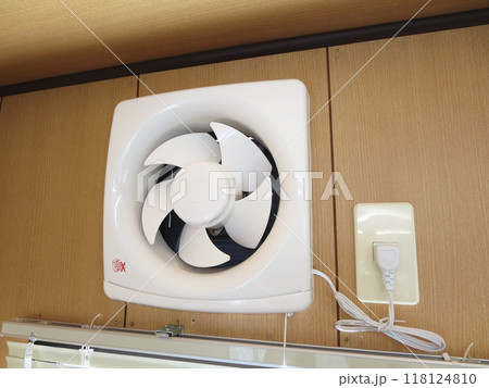家庭用キッチンでファンの回転で換気をする換気扇のイラスト