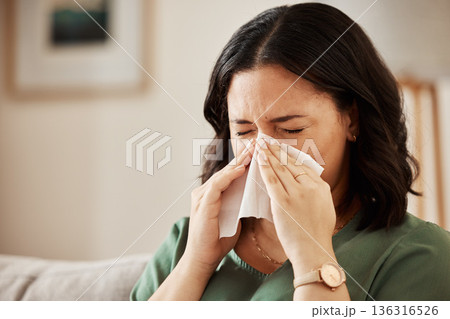 Blowing nose, tissue and woman in a living room with flu, cold and hay fever, crisis or viral infection in her home. Sneezing, allergies and person with virus or coughing illness in a lounge in house