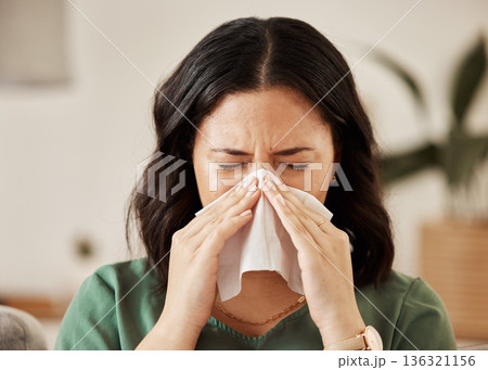 Tissue, blowing nose and woman in a living room with flu, cold and hay fever, crisis or viral infection in her home. Sneezing, allergies and person with health risk in a lounge or coughing illness