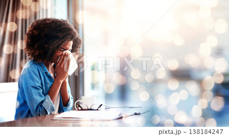 Woman, blowing nose and allergies while working from home, sick with virus and banner, mockup space and bokeh. Health crisis, flu and freelancer with toilet paper for sinus infection and remote work