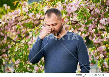 Man allergic suffering from seasonal allergy at spring in blossoming garden at springtime. Bearded young man sneezing and having runny nose in front of blooming tree. Spring allergy concept.