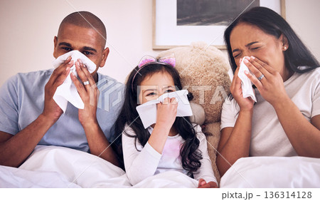 Family, sick and blowing nose on a bed together in a bedroom with allergy or virus and wipe with tissue. Disease, mother and father with kid or child with cold, flu and in winter as parents and girl