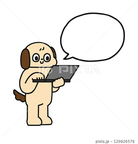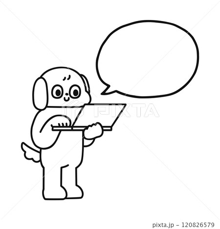 パソコンを操作するゆかいな犬と吹き出し 線画