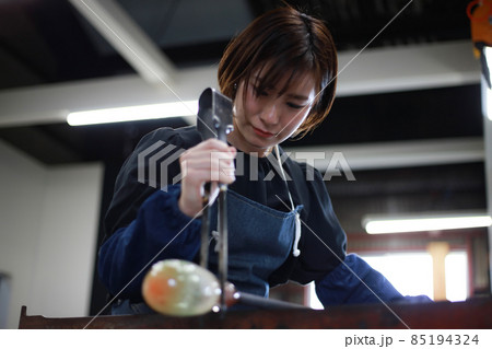 ガラス容器を作る女性 吹きガラス