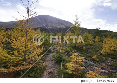 群馬県浅間山 スカイロックトレイルの吾妻火砕流上を通過中の景色 背景に浅間山2025年10月18日