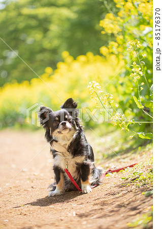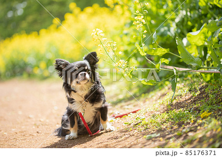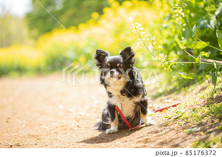 菜の花畑の横でオスワリをする黒いロングコートチワワ