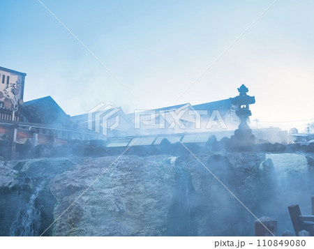湯畑の湯けむりの中の石灯呂