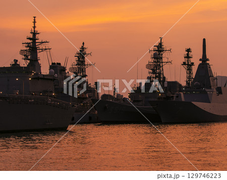 夕焼けに浮かぶ呉港の護衛艦群(広島・夏)