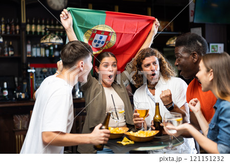 Group of cheerful people cheering for favorite Portuguese sports team in pub