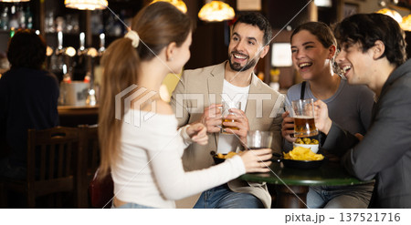 Group of happy friends resting and talking at bar