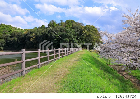 さきたま古墳公園内の桜と墳丘頂に桜咲く丸墓山古墳に周濠