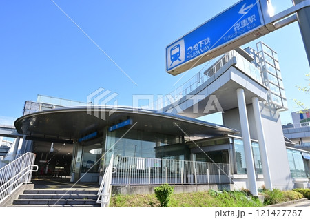 日本の横浜都市景観 8月。SOTETSU 西谷駅 南口などを望む。出入口わきにあるのは宅配便ロッカー