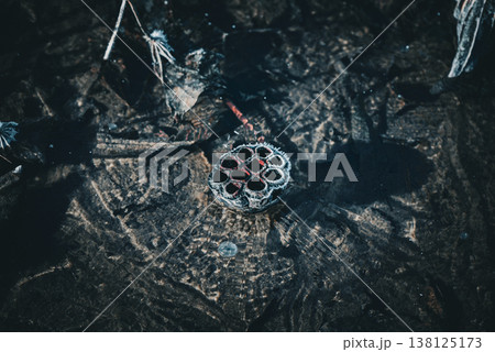 薄氷に閉じ込められた枯れ葉