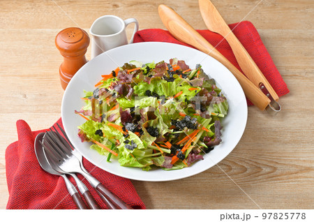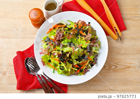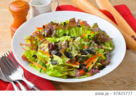 ドレッシングはかけていません。チョレギサラダ、韓国風サラダ、サニーレタスのサラダ。