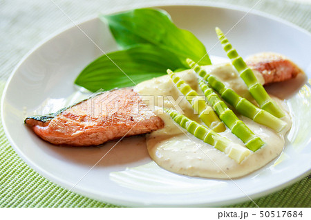 サクラマスの味噌クリームソース山菜添え