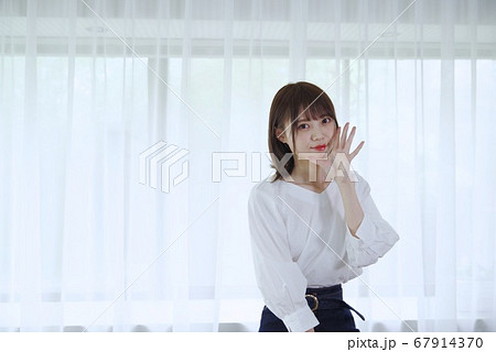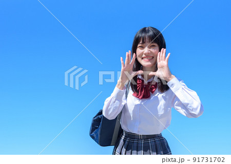 青空を背に叫ぶ、呼びかける女性 女の子 制服 女子高校生