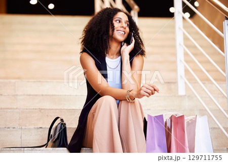 Smile, shopping phone call and woman at a mall for a sale, fashion and retail with a phone. Ecommerce, happy and thinking girl on a mobile conversation with shopping bags after a shopping spree