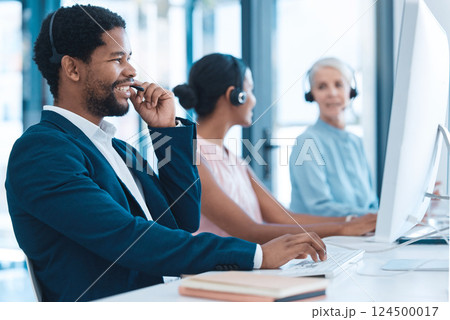 Support, consulting and a black man and woman in call center with headset and computer, help in customer service. Crm, telemarketing and sales for corporate communication employee talking online