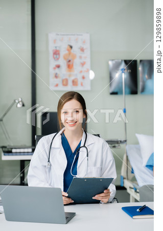 Young female doctor in white medical uniform using laptop and tablet talking video conference call at desk,Doctor sitting at desk